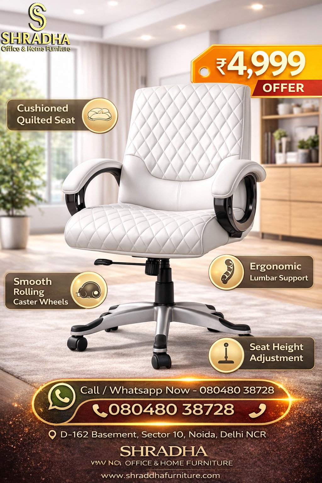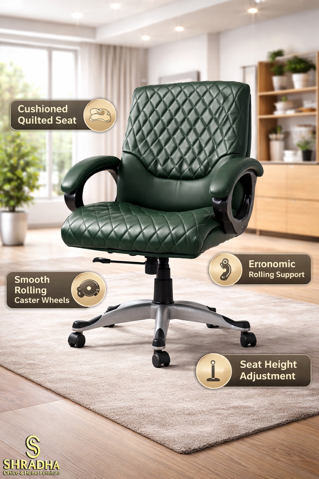 Introducing our Green Leatherette Medium Back Office Chair, designed for comfort and style in your workspace. This chair features a sleek green finish that adds a pop of color to any office environment. With a mid-back design, it provides excellent support for your back during long hours of work. The fixed armrests offer added comfort without compromising space. Perfect for professionals seeking a blend of functionality and aesthetics, this chair is an ideal choice for enhancing productivity in your office. Upgrade your seating experience today! Shradha Office & Home Furniture is a trusted name for modern, durable, and stylish furniture solutions in Noida and across Delhi NCR. We specialize in providing high-quality office furniture and home furniture that meets the needs of today’s fast-growing businesses and modern households. Whether you are setting up a new office, renovating your workspace, or upgrading your home interiors, we offer practical and cost-effective furniture solutions designed for long-term use. Located at D-162 Basement, Sector 10, Noida, Shradha Office & Home Furniture serves customers from Delhi, Noida, Ghaziabad, Faridabad, and Gurugram. Our focus is on delivering furniture that combines functionality, comfort, and modern design. We understand that both offices and homes require furniture that not only looks good but also improves productivity and daily usability. Our office furniture range includes modular workstations, ergonomic office chairs, executive tables, conference tables, reception desks, storage units, and complete office setups. Each product is designed with attention to detail, ensuring proper space utilization, durability, and comfort for long working hours. Our ergonomic chairs are built with features like adjustable height, lumbar support, breathable mesh, and smooth mobility to provide maximum comfort to employees. 📍 Address: D-162 Basement, Sector 10, Noida 📞 Call/WhatsApp: 08048038728 🌐 Website: www.shradhafurniture.com�